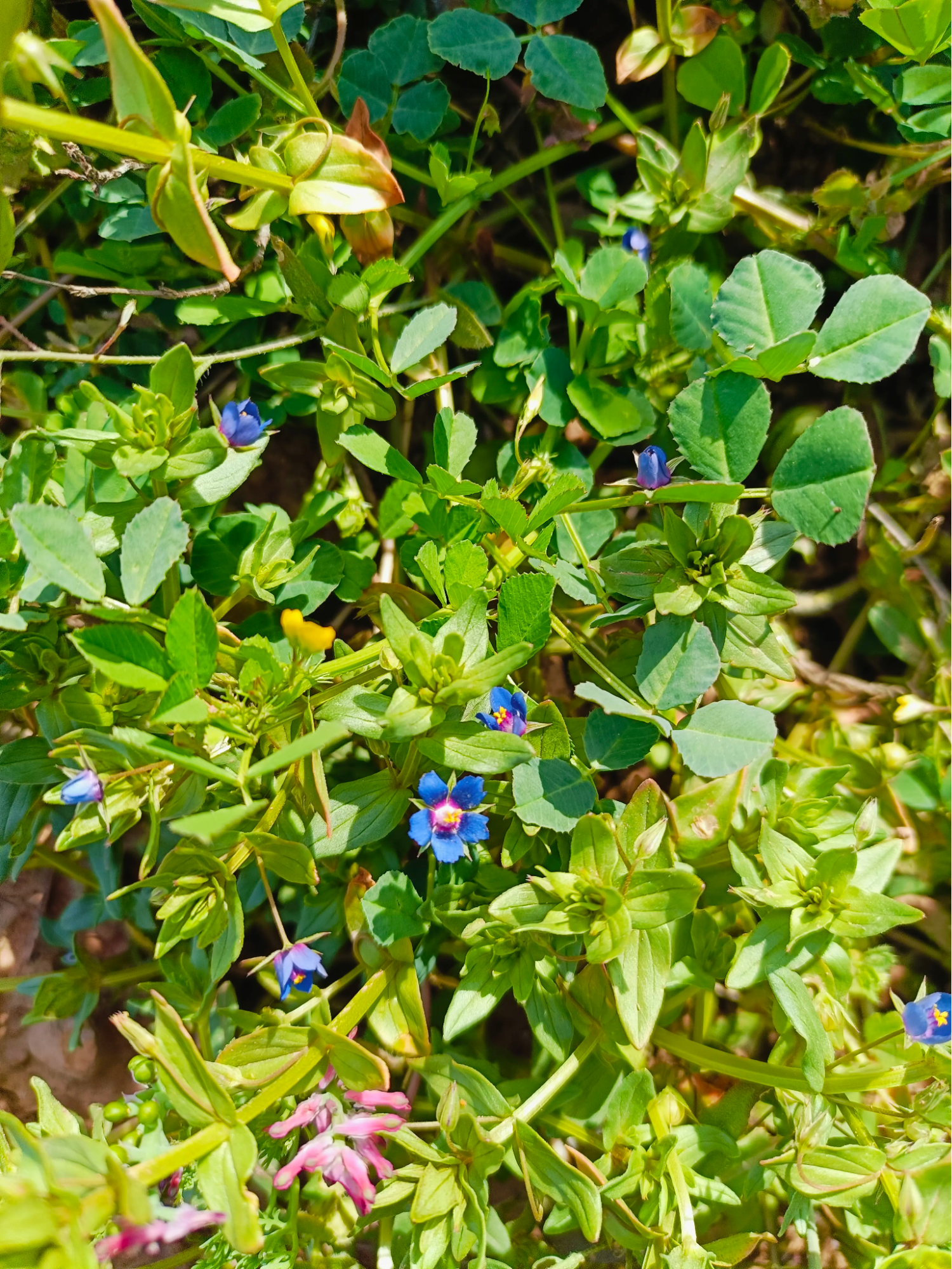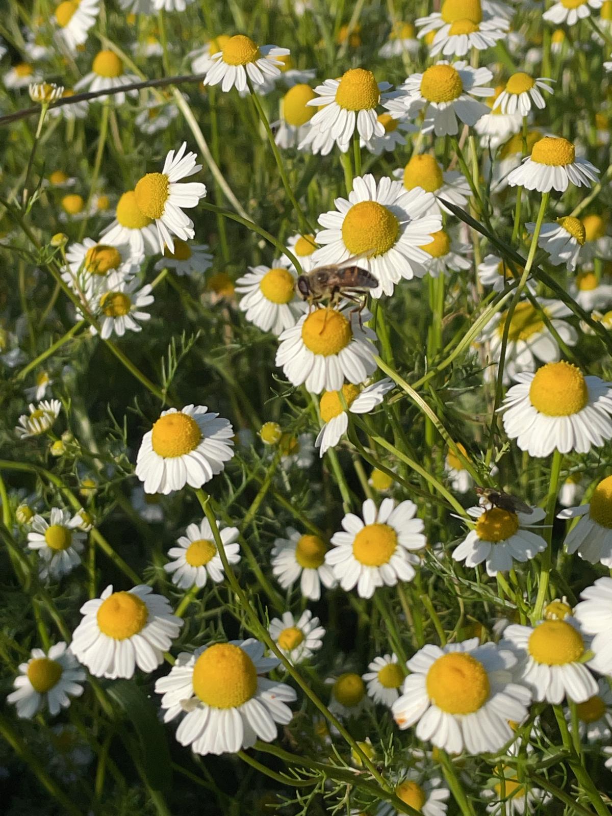 Organic matter remained on the land. Hay was spread in selected areas. Pioneer plants arrived first — amaranth, thistles, rockets, bur clover — followed by fennel, wild carrots, and other self-seeding species. Hay-supported areas produced abundant calendula and chamomile. Cooler, shaded zones welcomed lamiums and perennial clovers, laying foundations for long-term groundcover.