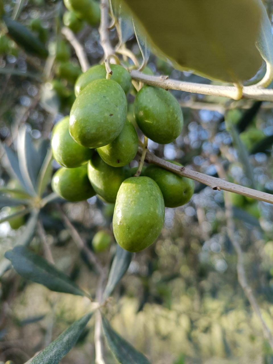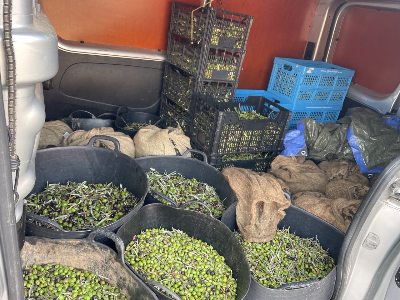 Smaller trees are harvested by hand. Larger trees are worked with manual or small electric tools. Harvested olives move immediately into shaded storage, layered carefully, and transported to the mill within a narrow time window.